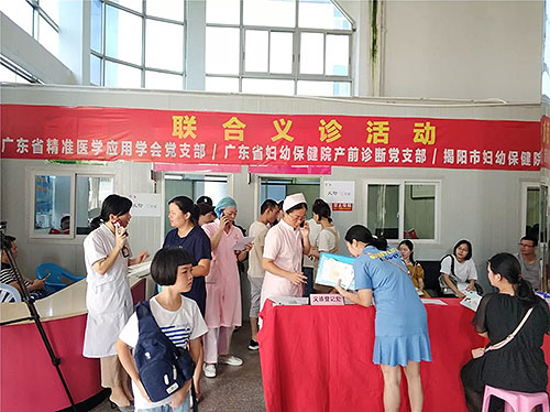 为热烈庆祝中华人民共和国建立70周年,纪念中国共产党建党98周年,深入践行“不忘初心、牢记使命”主题教育,广东省精准医学应用学会党支部充分发挥行业优势,积极探索推进会员党建工作,2019年7月27日,学会党支部联合广东省妇幼保健院产前诊断一、二党支部、广东省精准医学应用学会遗传病分会,来到揭阳,与揭阳市妇幼保健院党支部共同开展主题党日活动,组织开展了义诊、技能培训、健康宣教和学科建设、科研立项、防控技能指导服务等一系列的帮扶工作,并组织红色教育活动,寻访革命先辈足迹,追忆革命历史,传承红色基因。