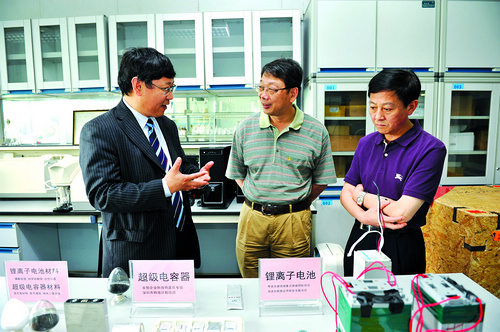 清华大学研究生院院长康飞宇在向陈希介绍他们新研发的产品