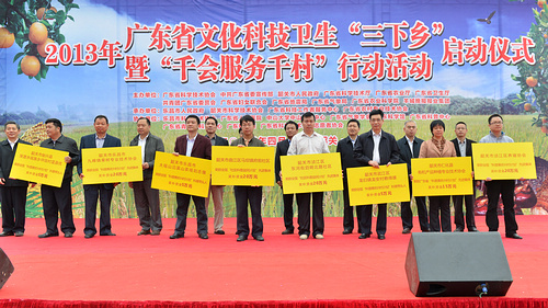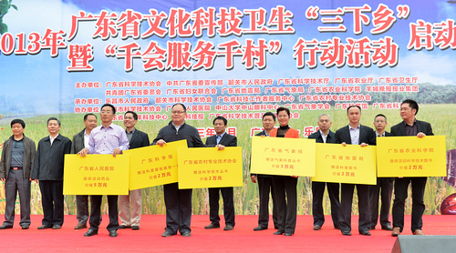 4月2日,由广东省科协联合省委宣传部、省科技厅、省农业厅、省卫生厅、省妇联、团省委、省地震局、省气象局、省农科院和韶关市人民政府等12个单位共同举办的2013年广东省文化科技卫生“三下乡”暨“千会服务千村”行动在韶关乐昌市正式启动。省委宣传部副部长蔡伏青、省科协党组成员、副主席吴焕泉、韶关市副市长孔云龙、省卫生厅党组成员、副巡视员王晓军、省气象局副局长刘作挺、省地震局副局长武守春、省农科院副院长易干军、羊城晚报报业集团党委副书记李和平、乐昌市委书记、人大常委会主任李维员、韶关市科协党组书记、主席郑适等主办单位领导出席了活动。现场农业生产技术咨询、科普展教、卫生诊疗等丰富多彩的活动,吸引了当地8000多名群众参与。