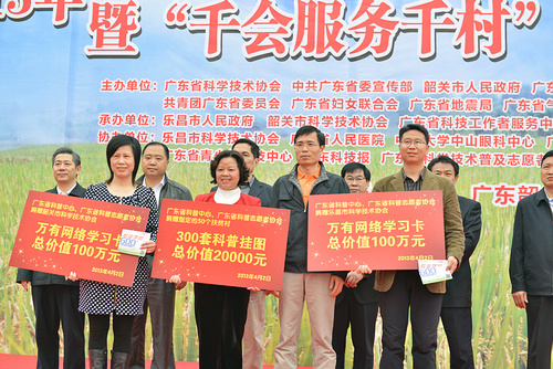 启动仪式上,广东省科协为韶关市获得全国、广东省“科普惠农兴村计划”表彰的先进单位和农村科普带头人、全国科普示范社区等颁发了牌匾及奖补资金。各主办单位及承办单位均投入大量的人力物力,参与到主会场的活动中。其中,广东省农科院赠送了一批价值2万元科学技术图书,广东省人民医院、中山大学中山眼科中心等分别为本次活动提供了价值5万元和3万元的药品,广东省气象局、广东省地震局等单位向当地赠送了相应的科普图书,广东科学馆也向乐昌市赠送了一套科普展板展架。而广东省科普中心也向韶关市及乐昌市赠送了价值200万元的就业实训通爱心卡。该爱心卡主要是用于网络学习,开展就业能力实训,有100多项就业必修课程,以此帮助普通院校毕业生、复转军人、待业青年等提高就业能力和科学素养。