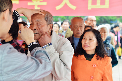 中山大学中山眼科中心的专家和科普志愿者在现场为当地群众诊治眼科疾病(刘雷 摄)