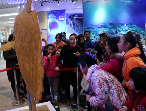 讲解员介绍现场展出的“翻车鱼”标本