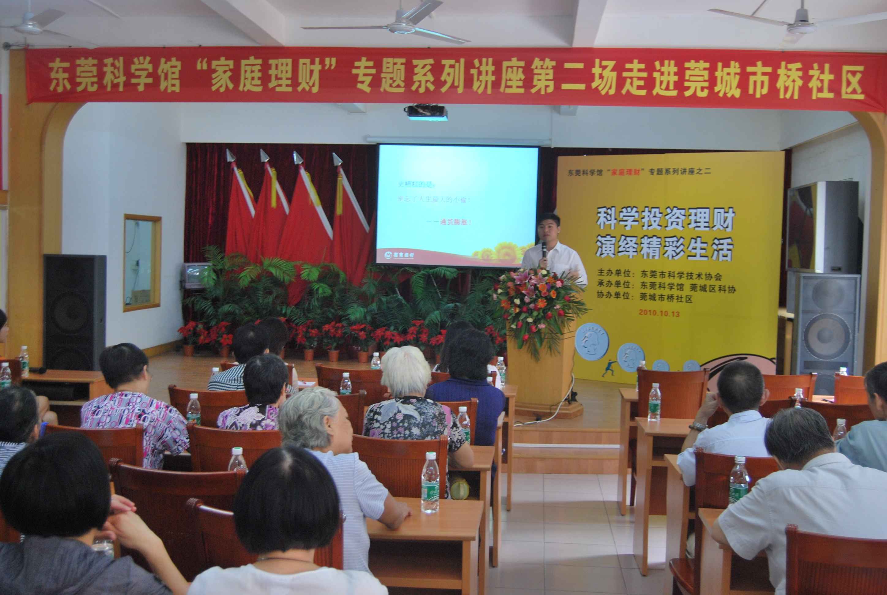面对持续的通货膨胀及楼市、股市、消费等种种泡沫经济现象,科学投资理财学习已是十分重要。为进一步普及广大市民的科学理财知识,由东莞市科学技术协会主办,东莞科学馆承办“家庭理财”专题系列讲座第二场——“科学投资理财演绎精彩生活”于10月13日上午9:00在东莞市市桥社区居委会举办.