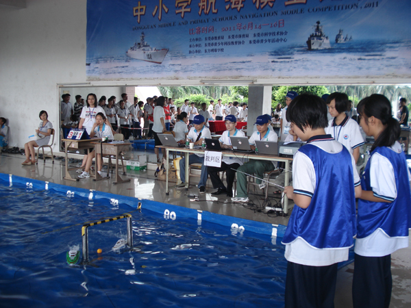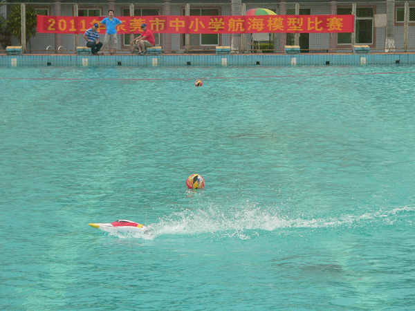 “3、2、1,放!”,随着裁判一声令下,一艘艘快艇飞驰而出,你追我赶,游泳池的水面上留下道道优美的弧线……,激流勇进、急速漂移等战术吸引了众多观众的眼球,呐喊声、加油声此起彼伏。小选手们手握遥控器,操纵电动快艇艇乘风破浪,上演了一场场水上大战。这是2011年东莞市中小学航海模型比赛遥控电动快艇绕标赛的比赛现场。6月14~16日,东莞市73所学校的668名选手进行了三天的激烈角逐,小选手们精美的航海模型在水池中披荆斩浪,进行了速度、智慧与勇气的PK,收获着他们的梦想。