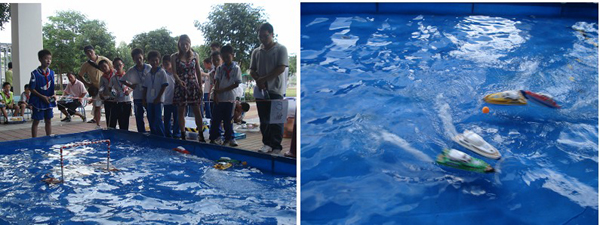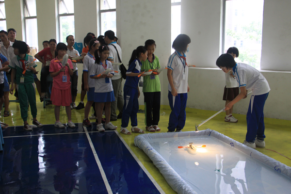 太阳能机械自划船制作航向赛,要求选手们首先在30分钟内将模型组装完整,然后手握人造光源(模拟太阳能)照射模型船上的太阳能板,太阳能板将光能转换成电能,靠电能驱动马达,船桨便自动划动奔向目的地。选手们在比赛中不但动手、动脑,还培养了“节约能源、保护环境”的环保意识。万江石美小学冯锦华最终以以所有选手中的最好成绩14.4秒获小学男子组冠军,较去年选手最好成绩19秒有了更大突破。