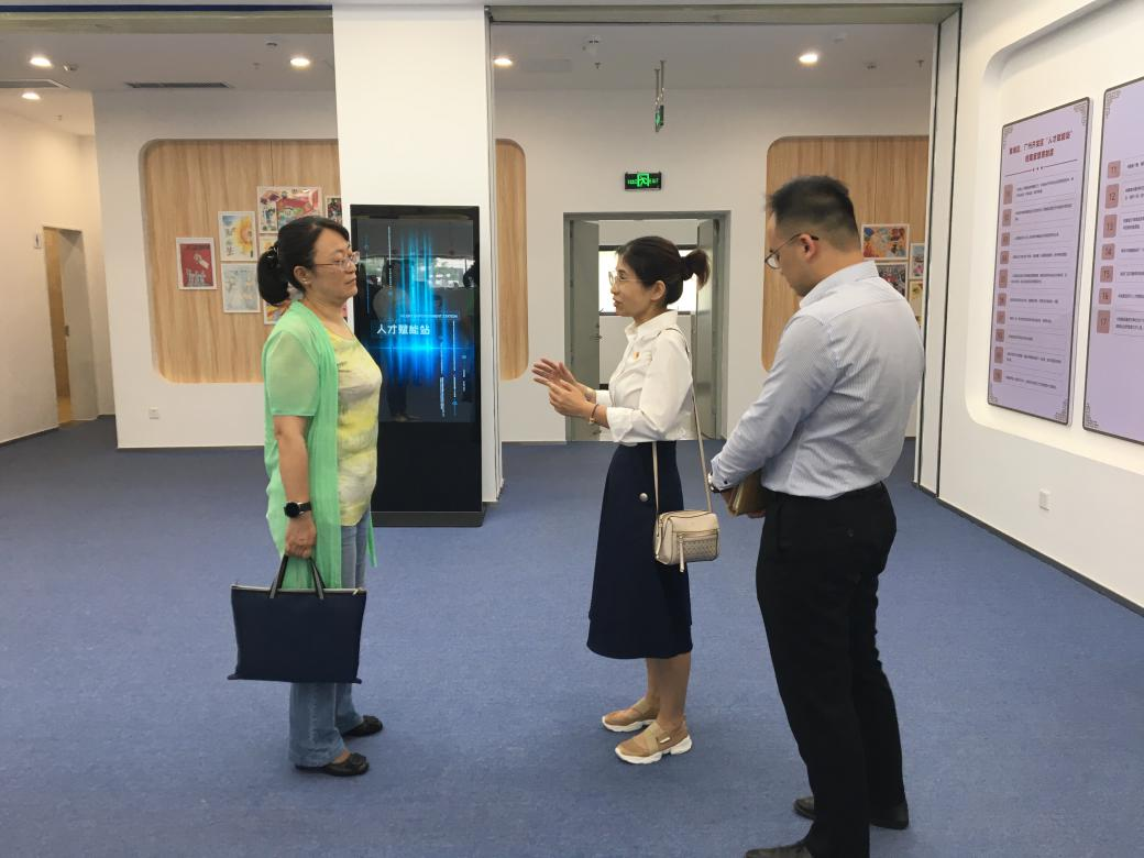 调研队伍首先来到国际人才自由港二楼的中新知识城党群服务中心参观,了解服务大厅的日常工作介绍、人才服务等情况。