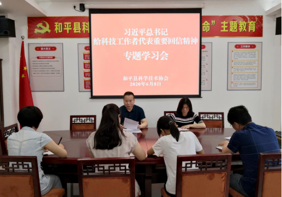 6月8日,和平县科协召开专题学习会,传达学习习近平总书记给袁隆平、钟南山、叶培建等25位科技工作者代表重要回信精神。