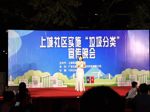 11月20日晚,河源市源城区上城社区“垃圾分类”宣传晚会在鳄湖公园的舞台上演,该活动河源市弘霞客企业科协承办。