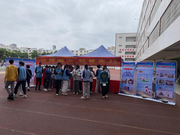 防震减灾科普知识宣传区,科技辅导员积极为师生们普及防震减灾科普知识,讲解避震的正确方法,进一步增强师生防震减灾意识,提高师生防震避震、自救互救的能力。活动共派发了300多份防震减灾宣传资料。