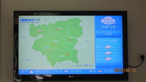 根据《河源市气象灾害预警信息发布系统(第一期)建设方案》及河源市政府有关文件的要求,河源市气象局在河源市科技馆科普展览厅设置安装了一台气象信息电子显示屏,并与市科技馆共同做好该设备的运行和管理工作。