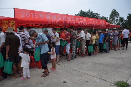 6月12日,由惠州市惠城区科协、区卫生局、区食药监局、区菜工办和汝湖镇等单位科普志愿者组成的科普惠民服务队来到到汝湖镇下围村科普活动广场,开展科技文化卫生“三下乡”活动,活动现场有农业科技、食品用药安全和蔬菜种植等方面的专家为群众咨询服务,医生为群众义诊,同时科普志愿者还向群众派发了一批菜种、化肥和科普图书,有300多名群众参加了现场活动,活动受到了群众的一致欢迎。