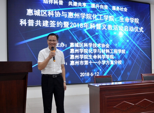 6月12日下午,惠州市惠城区科协与惠州学院化学与材料工程学院、生命科学学院科普共建签约暨2018年科普义教活动启动仪式在惠州市第十一小学方直分校举行。区科协主席刘忠辉、惠州学院化学与材料工程学院党总支书记谢伟强、副院长封科军及生命科学学院副院长周立斌以及区教育局、区文明局有关领导参加了仪式。区科协分别与两个学院签订科普共建协议。