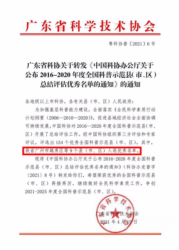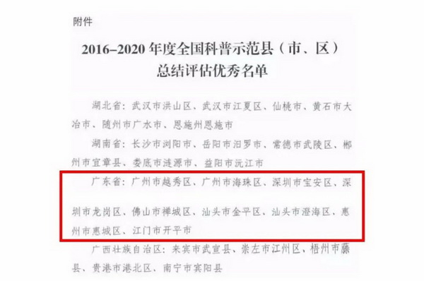 惠州市惠城区入选“中国科协2016-2020年度县(市、区)总结评估优秀名单”