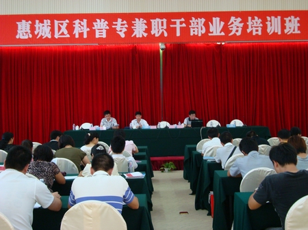 6月27日,惠城区科普专兼职干部业务培训班在惠州科技馆开班,来自全区各镇、街道、区全民科学素质工作领导小组成员单位的科普联络员,各科普示范社区、科普示范村、科普教育基地、农村科普示范基地的工作人员、大学生村官共60人参加了学习。市科协副主席邓森宏、普及部陈部长应邀出席了培训班并给学员授课。