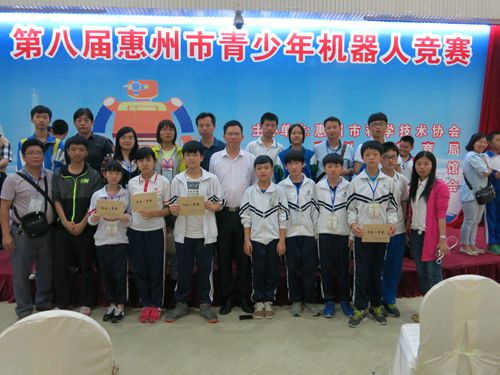 4月18日,第八届惠州市青少年机器人竞赛在惠州市科技馆胜利闭幕。惠阳区10支代表队参加比赛,勇夺7个一等奖、3个三等奖,并有6支代表队将代表惠州市参加5月8-10日在东莞市石龙中学举行的第十五届广东省青少年机器人竞赛,创造了历史最好成绩。