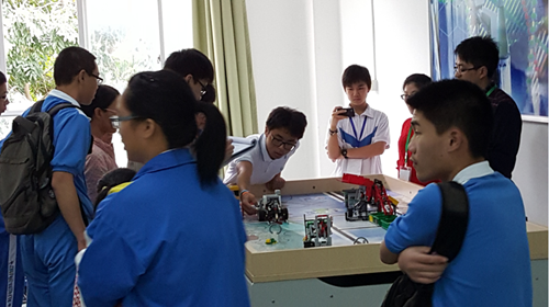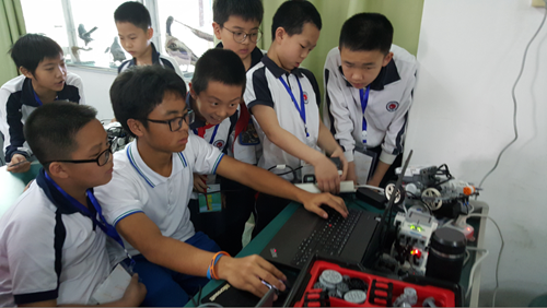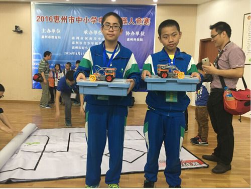 4月15日,由惠州市教育局主办,惠州市河南岸中心小学、惠州市青少年机器人协会和惠州市好小子机器人研究中心承办,惠州科技馆协办的2016年惠州市中小学电脑机器人竞赛在惠州市河南岸中心小学隆重举行。来自全市52所中小学校152支代表队的200名学生参加了竞赛活动。华南师范大学附属惠阳学校的黄梓轩、陈志勇同学分别荣获中鸣超级轨迹赛亚军和三等奖;龙俊豪、彭雨熙同学荣获西觅亚FLL工程挑战赛三等奖。黄梓轩同学还将代表惠州市参加广东省第十三届中小学电脑机器人竞赛。