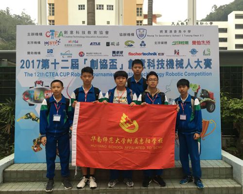 11月18-19日,2017年第十二届“创协杯”(CTEA CUP)创意科技机器人大赛在香港将军澳香岛中学隆重举行,来自香港和内地的280多支代表队近1000名选手参加了本次大赛。比赛中,华南师范大学附属惠阳学校3支代表队不负厚望,沉着应战,经过激烈比拼,均夺得一等奖。其中,“惠阳华附超级2队”王文豪、汪楚杰和“惠阳华附超级1队”魏煜、曹泠筠获超级轨迹赛高级组一等奖,“惠阳华附创新1队”李宇涛、李俞奇的“智能电动车”获电子科技创新设计高级组一等奖。