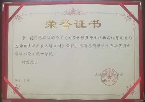 日前,惠州市第十五届优秀科学学术论文评委会公布评选结果,惠州市惠阳区科技工作者荣获一等奖1篇、三等奖7篇的优异成绩。其中,惠阳区水果协会李花同志的《热带常绿多年生植物荔枝芽发育形态学特点及其表达谱分析》荣获一等奖,是各县区唯一获此殊荣的论文。