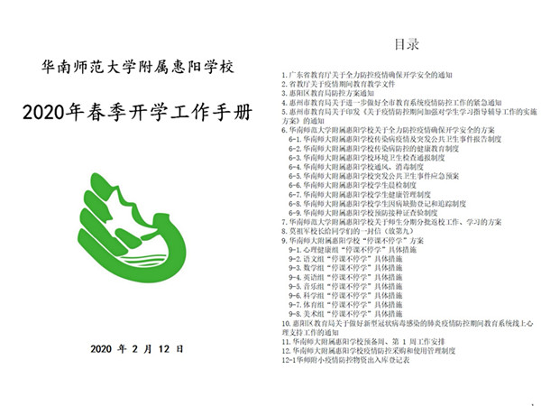 面对严峻的防控形势,以莫祖军校长为首的校长班子和行政领导,身先士卒,冲锋在前。整个寒假里莫校长每天坚守岗位,及时发布疫情动态、校园防疫措施和上级通知,同时迅速组建校园防控新冠肺炎领导小组。在学校领导小组的总体部署和纵深推进下,各部门各处室积极制定相应工作方案,分工明确,协作联动,筹划在前,执行有力,把“抗疫”工作落到实处,落到细处。最有超前意识的是组织编制了《华南师范大学附属惠阳学校2020年春季开学工作手册》,内容详实,部署合理,措施得力,指导性强,这在全市内各所学校中当属首创。