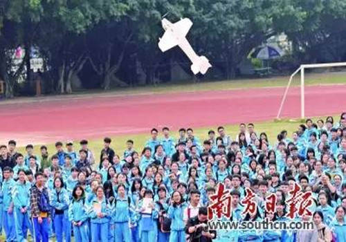 一阵引擎轰鸣划破长空,几架飞机模型冲上天空,忽高忽低,划出的弧线在蓝天白云的映衬下,煞是好看,也拉开了惠州市实验中学科技节的序幕。
