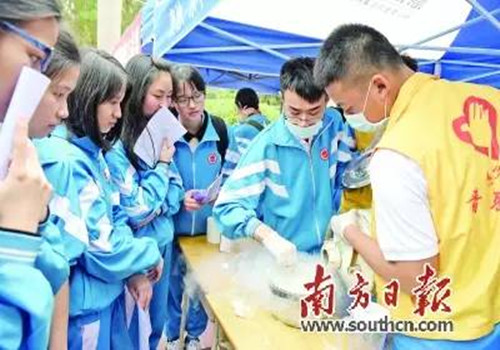 第十五届惠州市青少年科技创新大赛一等奖获得者、高二学生刘俊杰及其团队带来的“液氮冰激凌”让人眼前一亮、备受追捧。液氮迅速挥发时,仿佛施了魔法一般,释放出剧烈的烟雾,待烟雾散开,冰淇淋也完成了急速成形,这时候,参与体验的同学便可以尽情享用了。刘俊杰说,自己的构想源自于灵活运用化学课本上的知识,借科技节之际,能和各个年级的同学们一起享受科技带来的乐趣,十分开心。