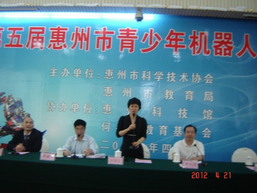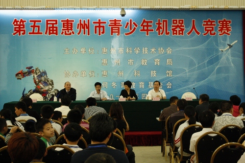 由惠州市科协、教育局联合举办,惠州市科技馆、何冬青教育基金会协办的第五届惠州市青少年机器人竞赛于4月21日至22日在惠州科技馆举行,来自市直、县(区)的7个代表的46支队伍、100余名参赛选手和50多名指导老师参加了本届竞赛的角逐。陪同的家人和观众约500人观摩了比赛。