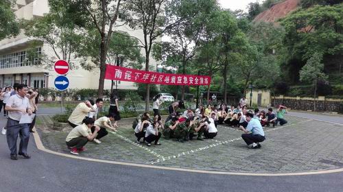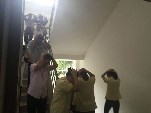 演练开始后,警报骤然响起,酒店负责人通过扩音器宣布酒店启动防震应急预案,并关闭电源,指挥人员选择安全位置抱头蹲下。随后,在酒店负责人的带领下,每个人向操场有序疏散。不到3分钟,参加演练的150多人就有序地疏散到开阔的运动场,完成了应急疏散演练。