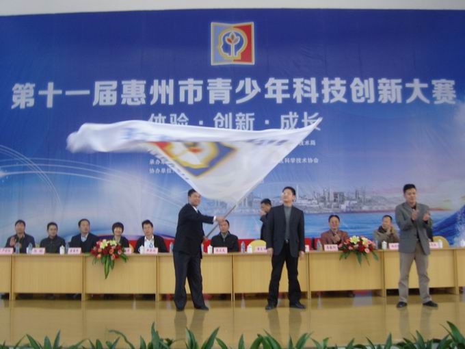 在闭幕式上,惠州市龙门县科协主席李浪文同志受龙门县政府领导的委托,从惠州市科协领导手上接过大赛会旗。迎接第十二届惠州市青少年科技创新大赛2013年在龙门县举办。