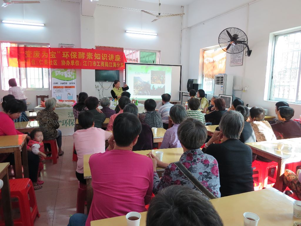 江门市江海区科协为进一步提高社区居民的生态文明意识,树立生态文明观念,于11月27日联合市工商局江海分局在仁美社区开展“变废为宝”环保酵素知识讲座,现场吸引70多名社区居民参加。“今天的讲座很有意义,制作酵素,变废为宝,环保又健康,我打算马上行动。”居民徐阿姨开心的说道。 通过社区环保达人的讲解,居民们都觉得收获颇多。不仅让更多的人了解到酵素在生活中的用处,还让更多的人参与到保护环境的队伍中去,将环保知识深入普及到社区,号召大家共同参与环保、支持环保、实践环保、践行绿色生活理念。