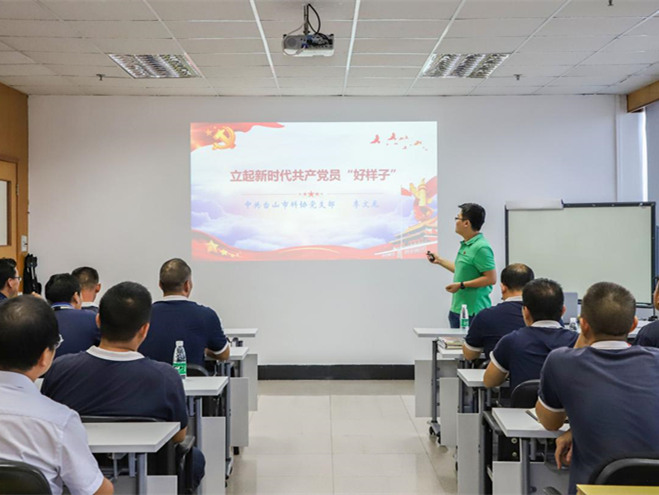 台山市科协党支部书记李文龙为华美党支部全体党员讲授“立起新时代共产党员‘好样子’”专题党课。党课以党员的“好样子”、党员的“不好样子”和怎样做到党员“好样子”三部分内容进行。围绕着“信仰”和“担当”两个关键词进行阐述,对党员同志如何坚定信仰立足岗位,在新时代有所担当、有所作为进行分析。并结合在企业党建、日常管理等方面工作,提出不仅要牢共产党员的初心和使命,充分发扬工匠精神,发挥党员模范先锋作用,带领其他企业员工共同为我国社会主义建设添砖加瓦,为台山市经济发展贡献华美力量。