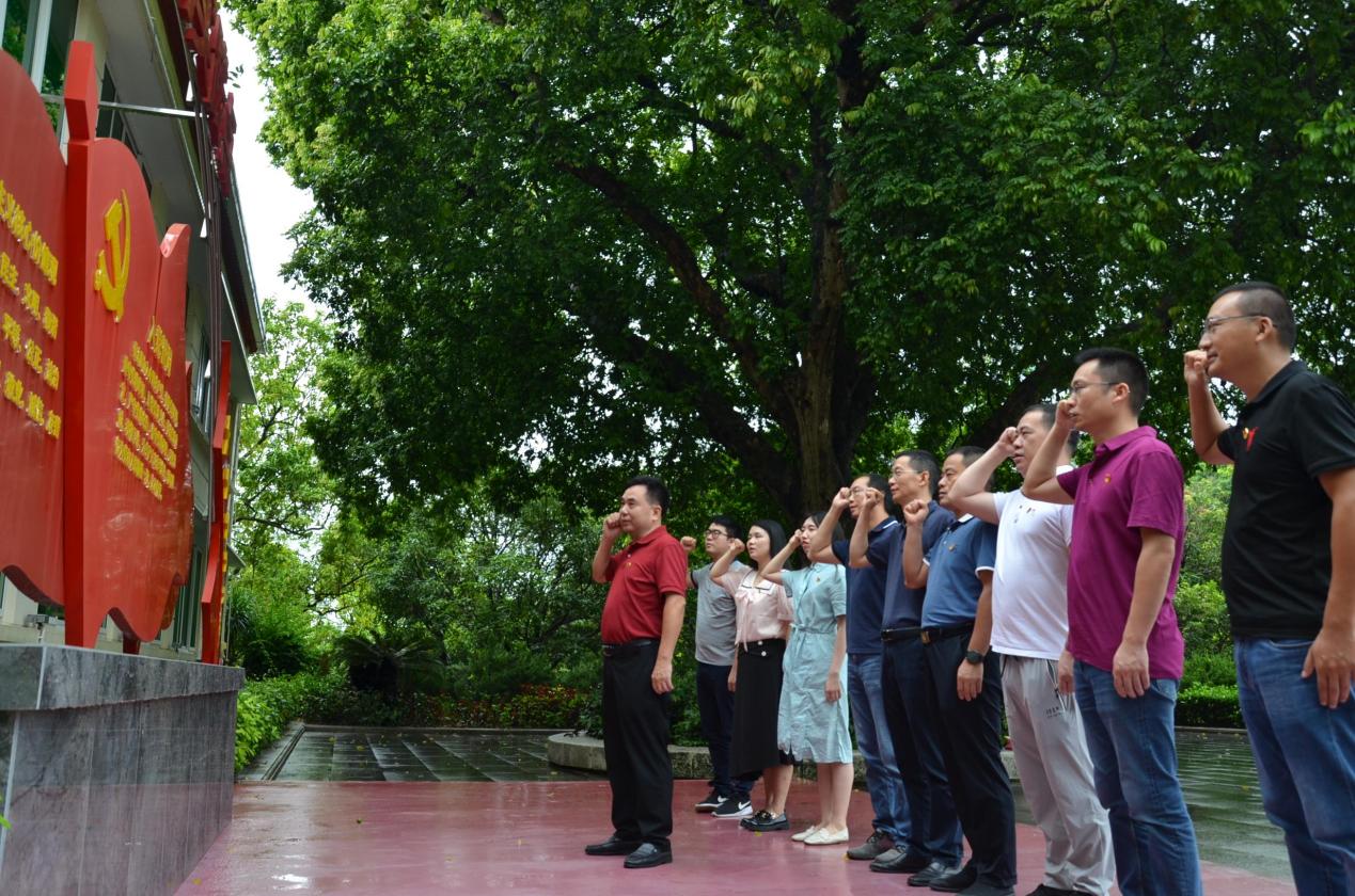 会后,全体党员在纪念馆门前的宣誓广场,面对鲜红的党旗,高举右拳,再次重温入党誓词,铿锵有力地说出对党忠诚的誓言。