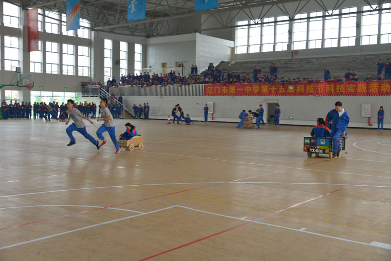 “科技实践”以载人纸箱车竞赛,将科技节活动推向一个高潮。活动以班为单位自制参赛用纸箱车,车不得借助机械动力,在规定跑道上经转弯处往返,按计时成绩分出胜负。这是一场科技知识运用的大比拼,也是一场合作、能力的较量。每次伴随着跑道上纸箱车并驾齐驱,偌大的体育馆里爆发出雷鸣般的喝彩声。奔驰的小车放飞了同学们对科技追求的理想。