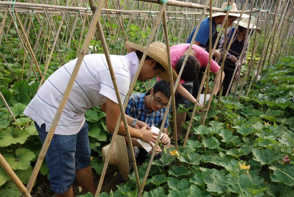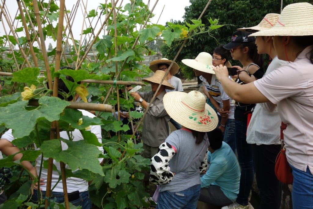 当日下午,在基地的农技人员的指导下,参观了科研基地,讲解水稻、蔬菜、玉米等作物的现代栽培技术、优良品种的特征特性。师生们看到田间硕果累累,十分兴奋,就品种种植要求,与产量相关性状,蔬菜水肥一体化和水稻“三控”新技术实施细节等提出了不少问题,得到基地农技人员的解答交流。同时,学生们分别以水稻、南瓜、节瓜3 个选育小组,进行了栽培和育种学习实践,亲自动手在田间做杂交,测性状,不少同学直呼实习接地气,有收获,学到了不少课本上学不到的操作知识。