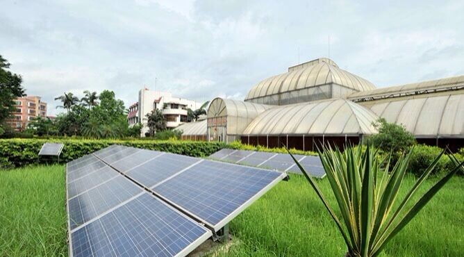 这么庞大的设备从哪里找动力?原来是用太阳能。在逾千平方米的智能温室外面,游客们看到新增了十几块太阳能板,整齐排列在草地上,用以提供温室智能降温的电力能量。全套智能降温电站的建立是将目前比较先进和流行的太阳能光伏发电技术应用到农业生产领域的一个示范性工程,利用半导体的光电效应将太阳能转换成电能,年发电量为7000度,可以给5.8个家庭提供一年的电量。不但能力足,而且属清洁能源,不会产生二次污染运行。除降温外,产生电力还可用于作物灌溉,暨方便又省力。该基地作为本地新农业技术的“风向标”,也是全国农业旅游示范点、全国科普教育基地,创新使用该套智能设备,大大提高了游客观赏舒适性和农业生产效率,也促进了太阳能相关科普知识普及。