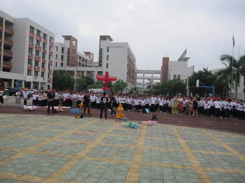 本次科普活动内容有:科学实验秀《神奇的液态氮》,移动球幕影院精彩影片《太阳系之旅》,九连环、拓扑学、透视镜、巧布哨兵、双面绣等挑战科学知识和脑力智力的车载展品、益智展品,灵活多变的机器人表演也获得师生们的阵阵欢声和掌声,同时邀力邀东莞科技馆创意航模表演队前来助阵。表演队带来的航模空中大战、彩色乒乓球雨、飞天猪与愤怒的小鸟等航模表演也给师生们带来了惊喜,让他们近距离充分感受到科学的神奇与魅力。