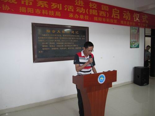6月13日,由广东科学馆、揭阳市科协、揭阳市科技局联合主办,揭阳市科技馆、揭西县科协、揭西县坪上中学承办的广东“科普大篷车”进校园暨助力创建文明城市系列活动在揭阳市揭西县坪上中学举行启动仪式。广东科学馆馆长何少强,揭阳市科协主席陈伟军,揭西县人民政府副县长刘小电出席了启动仪式并作讲话,揭阳市科技局副局长洪镇海参加启动仪式,仪式由揭西县科协主席蔡喜生主持。