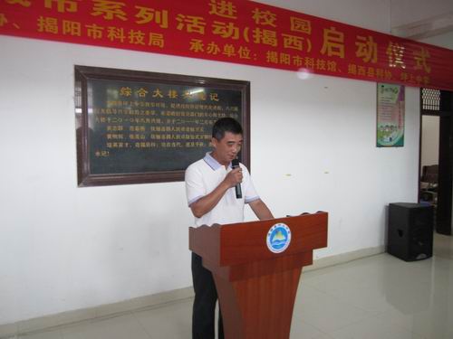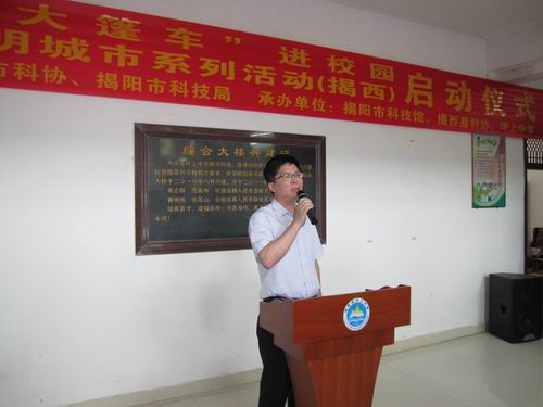 启动仪式上,何少强馆长发表讲话。他表示,广东科学馆从2011年起,便充分整合优质科普资源,不断增强科普展品的互动性和趣味性,利用科普大篷车在全省范围内开展科普巡展工作,为基层提供便捷高效的科普资源和丰富多彩的科普服务,已经成为我省深入开展科普服务活动的一个品牌。陈伟军主席要求,全市科协系统要以这次“科普大篷车”进校园系列活动为契机,进一步整合社会资源,从实际出发,因地制宣把“科普大篷车进校园”工作做实做好,为提高青少年的思想道德素质和科学文化素质作出新的贡献。刘小电副县长致辞表示,本次活动是揭西县开展科普行动的一次大好时机,将进一步提升揭西县广大干部群众和青少年学生学科学、爱科学、用科学的热情,是助力创建文明城市活动的一项重大举措。
