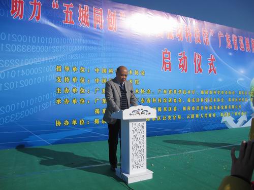 1月12日上午,助力“五城同创”“中国流动科技馆巡展”活动揭东站启动仪式在揭阳市揭东区田田绿新农业科普示范基地文化广场举行。广东省科协党组成员、副主席吴焕泉,省科协科普部部长吴仕高,广东科学馆馆长何少强,副馆长张碧华,揭阳市科协主席陈伟军,副主席刘建其,揭东区委副书记陈建雄,揭阳市各县(市、区)科协主要负责人,揭东区党委、政府相关部门及各镇(街道、开发区)分管科协工作领导,科普志愿者和桃围学校师生代表400多人参加启动仪式。启动仪式由揭东区副区长张木奋主持。