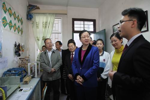 慰问组走访慰问优秀科技辅导老师莫斯亮(右一)并参观科技创新成果