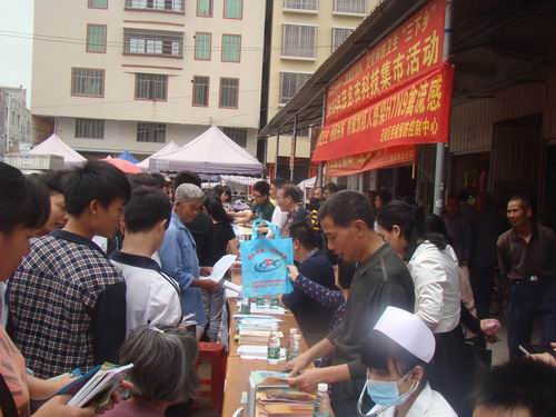 3月19日上午,茂名市茂南区袂花镇圩市场人头涌涌、热闹非凡,值该镇圩日,茂名市科协、茂南区科协组织茂名市地震局、茂名市气象学会、预防医学会、药学会和茂南区疾控中心、畜牧局、农业局等单位,在这里举办茂名市2015年“三下乡”科技集市活动,为当地群众普及科学知识和提供科技咨询服务。这是茂名市2015年科技文化卫生“三下乡”系列活动之一。