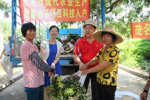 茂名市科协主席黄少兰(右一)在活动现场向农户派发油茶栽培技术宣传资料