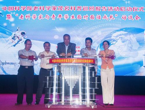 老科学家张厚英(中)与出席活动的相关领导共同启动“中国科学院老科学家茂名科普巡回报告会”