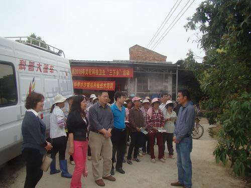 培训会现场,组织了科普大篷车下乡宣传,向群众派发农村实用技术丛书,邀请了当地农业专家为60多户沙糖桔种植农户做技术培训,还专门到田间地头为种植户进行现场指导,讲授沙糖桔种植前期的浇水、施肥、剪枝以及病虫害防治等方面的知识,帮助农户解决提高沙糖桔育苗成活率及挂果率、提升沙糖桔果质和口感等技术问题,提高农户的科学种植、管理水平,深受农民群众的欢迎。
