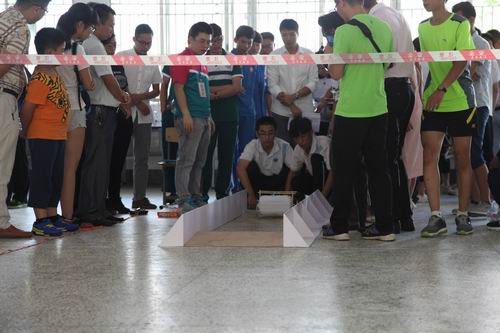 高中组“奔跑吧,环保车”(塑料瓶车障碍赛)现场