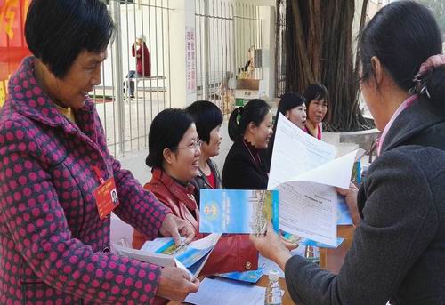 茂名市科协党组书记、主席黄少兰(左二)向市民发放宪法宣传资料