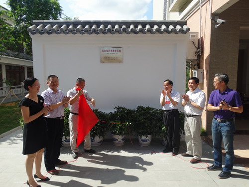 茂名市政协副主席、科技局局长崔锡明(右三)等有关视察组领导为被命名为“茂名市科普教育基地”的广东南粤沉香博物馆揭牌