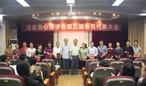 朱健超为新一届理事成员颁发聘书,并希望学会加强制度建设,规范学会工作;加强心理科学学术活动,创建会员交流平台;强化社会职能,面向群众,服务社会;积极参政议政,从专业视角为地方政府做参谋;大力发展会员,壮大专业队伍,增强社会影响力,为茂名市心理学工作发展作出更大的贡献。