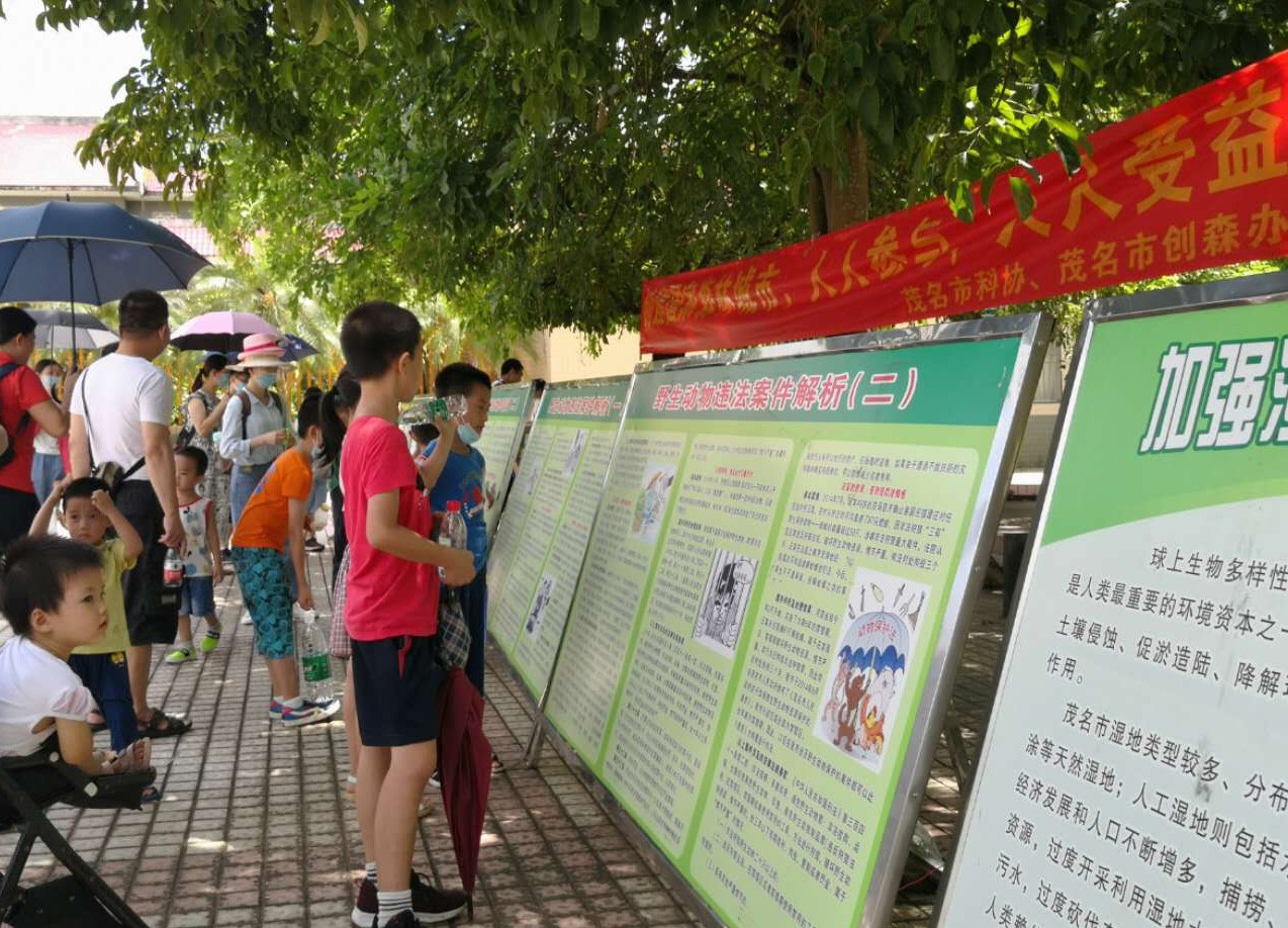 随后全体人员前往活动的第二站——茂名森林公园科普教育基地。在园内的“勇敢者之路”科普宣传长廊前,工作人员组织开展创建国家森林城市宣传和“文明共建 科技同行”社会主义核心价值观专题教育活动,引导学生深入理解社会主义核心价值观的内容,开展问答游戏,向学生、家长倡导养成讲文明、讲礼貌的良好习惯。同时,活动方还组织参观了科普馆,组织观看动植物标本和科普挂图,增强其保护生态环境的意识。