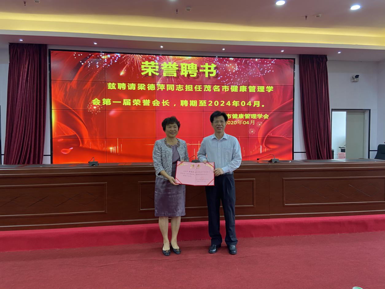 培训班上,余其同为茂名健康职业学院院长梁德萍颁发茂名市健康管理学会第一届荣誉会长荣誉证书。梁德萍表示,茂名健康职业学院一直秉持“大健康”理念,推动茂名市健康事业发展,共建共享健康中国,为营养医学、营养科普积极作贡献。