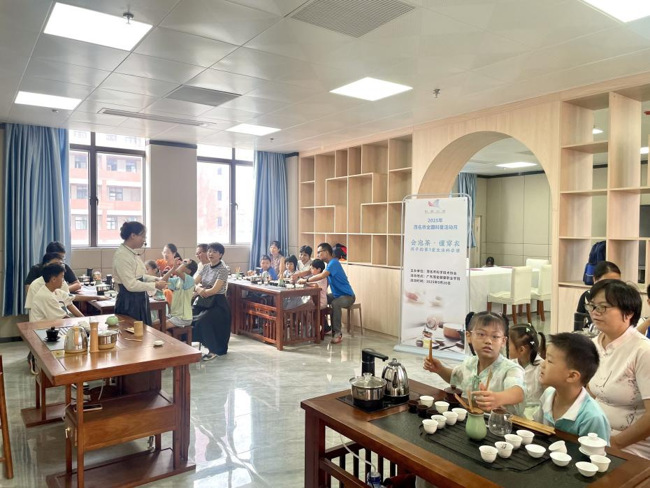 活动现场,茶艺科学体验区格外热闹。专业指导教师首先演示了不同水温对茶叶品质的影响,孩子们在家长的陪伴下,仔细观察茶叶在热水、温水和沸水中的形态变化,学习"热水醒茶、温水润茶、沸水释茶"的科学原理。在实践环节,每个家庭都亲手调配了适合夏季饮用的清凉茶饮,既学到了科学知识,又掌握了生活技能。